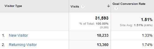 Also, look at New Visitors vs. Returning Visitors. Is the Goal Conversion Rate of one more than the other or are they equally as effective ?